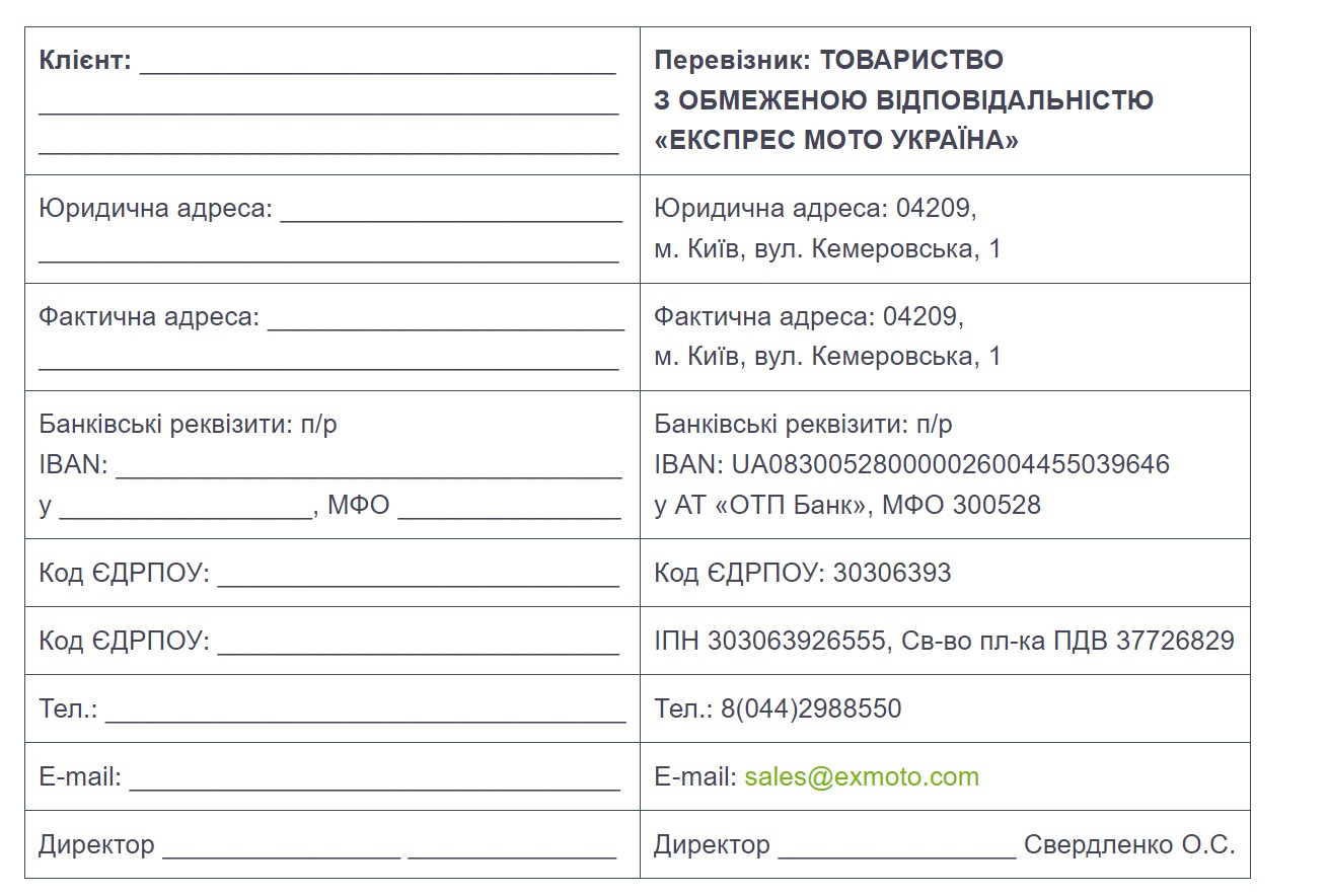 "Повна юридична назва компанії", надалі по тексту іменоване - «Клієнт», в особі директора"П.І.Б.", який діє на підставі Статуту, з однієї Сторони, і Товариство з обмеженою відповідальністю «ЕКСПРЕС МОТО УКРАЇНА», надалі по тексту іменоване - «Перевізник», в особі директора Свердленка Олександра Сергійовича, який діє на підставі Статуту, з іншої Сторони, - разом в подальшому іменовані «Сторони», уклали цю Угоду про впровадження електронного документообігу, на наступних умовах: